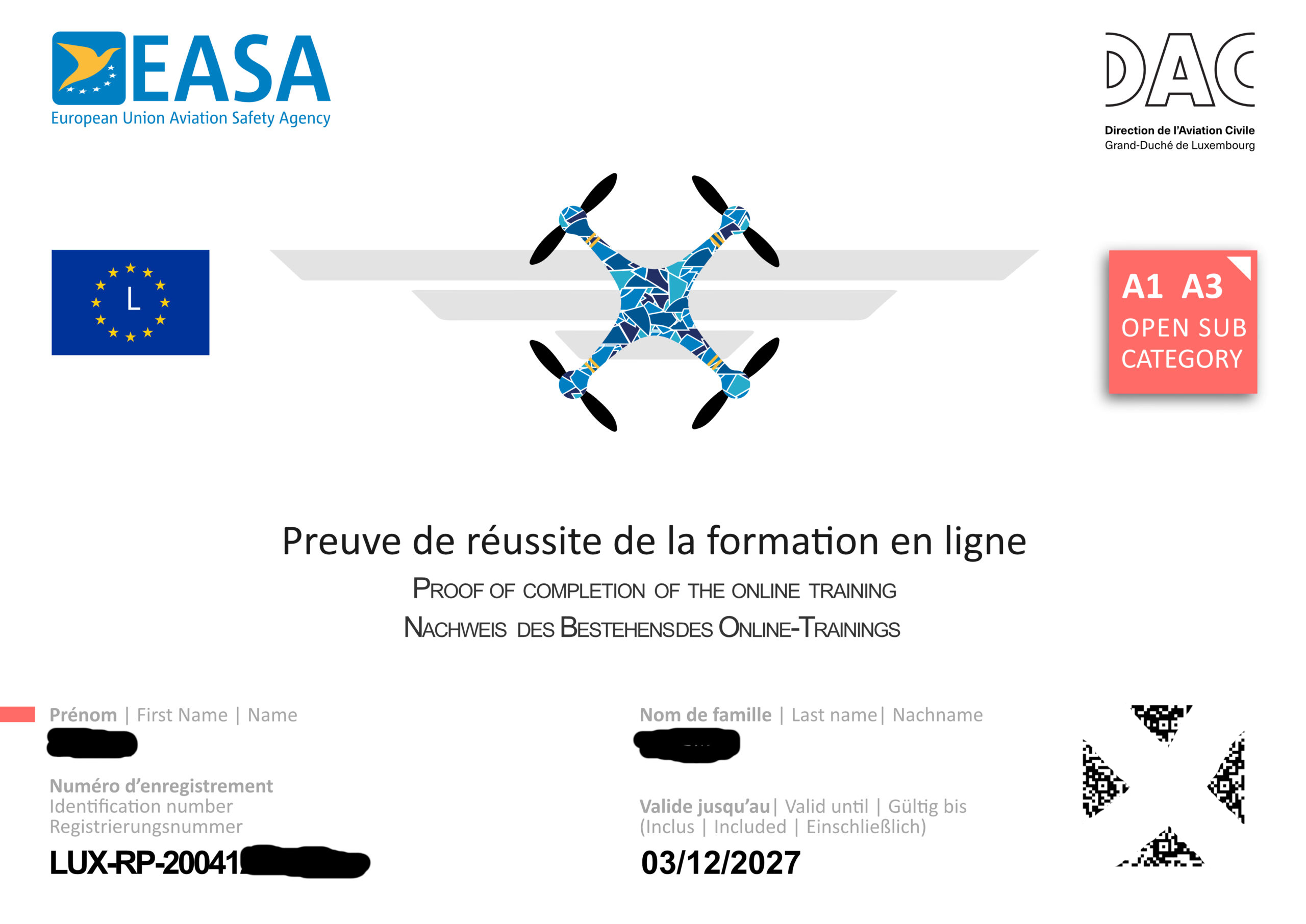 L’attestato di pilotaggio EASA A1-A3 è una certificazione che consente di operare droni secondo le normative stabilite dall’Agenzia dell’Unione Europea per la Sicurezza Aerea (EASA). Questa certificazione è parte del sistema di regolamentazione europeo per i droni, che mira a garantire la sicurezza e l’efficienza delle operazioni di volo.